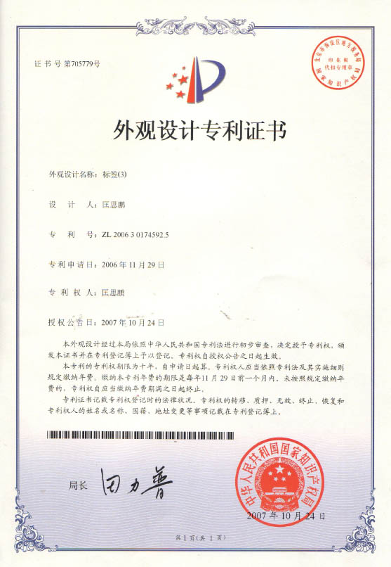 標籤外觀設計專利證書1